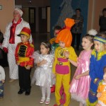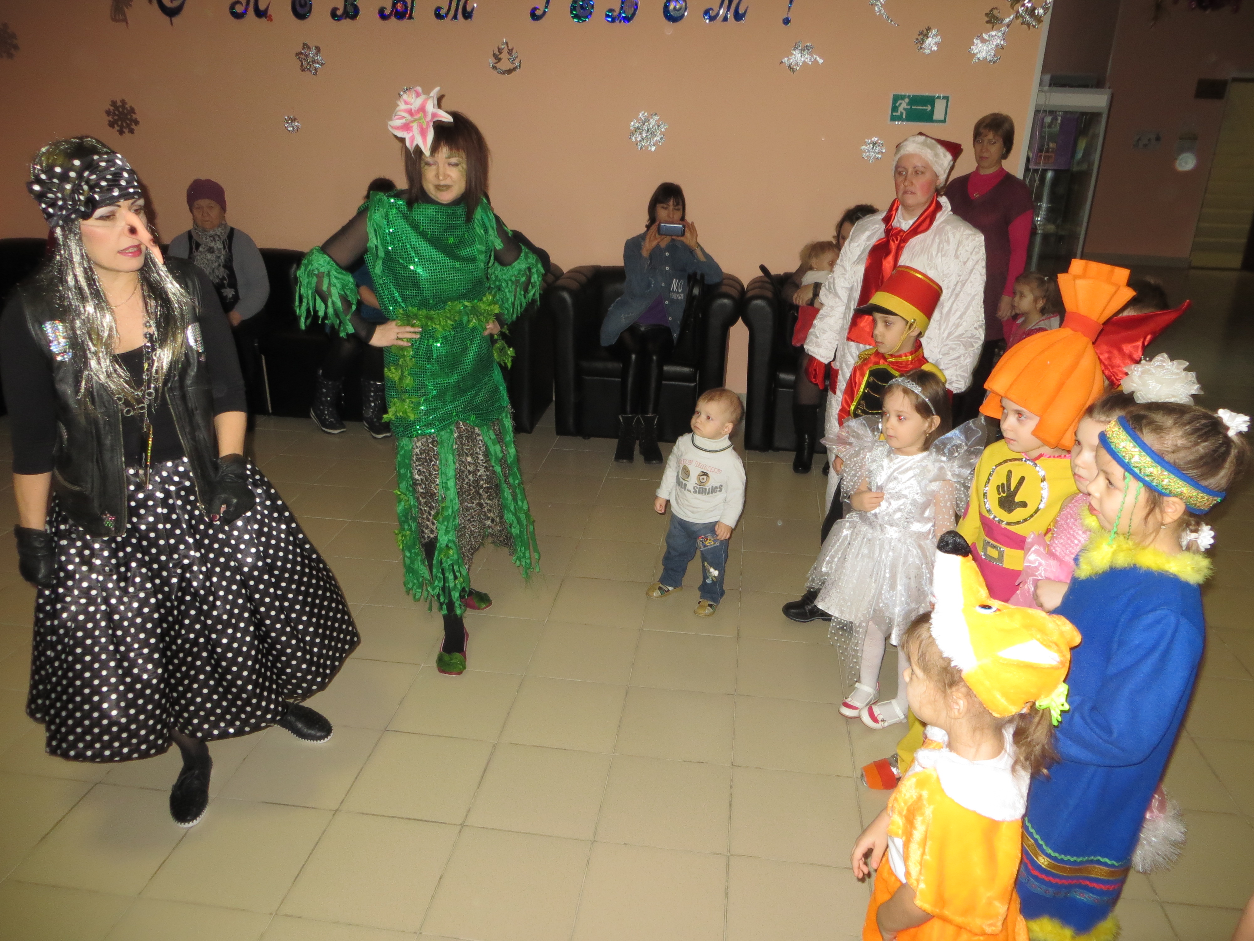 В ярко украшенном фойе библиотеки читателей и гостей встречали сказочные персонажи: Снеговик и Лесовичёк. Они поздравили ребят с наступающим Новым годом и пригласили на театрализованное представление у новогодней елки, по сюжету которого Чёртик, чтобы испортить Новогодний праздник крадет посох Деда Мороза, а Снеговик и Лесовичёк вместе с ребятами, освещая путь волшебным фонарем, идут на его поиски. У ёлки ребят встречает лесная нечисть. Ребята с удовольствием проказничали вместе с Бабой Ягой, Кикиморой и Чёртиком: отгадывали хитрые загадки, кидались снежками и танцевали. С Дедом Морозом и Снегурочкой ребята зажгли разноцветные огни на елочке, водили хороводы, играли в игры, рассказывали стихи и пели новогодние песенки.