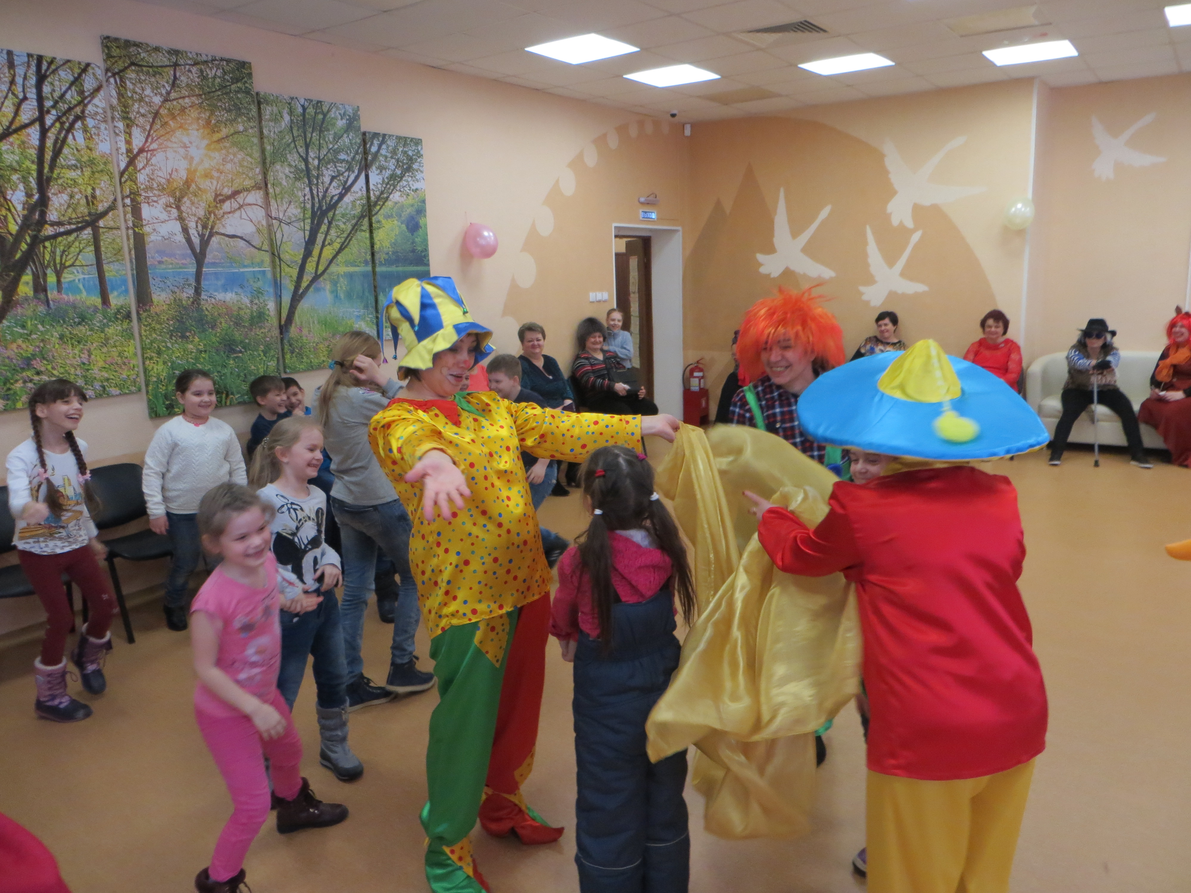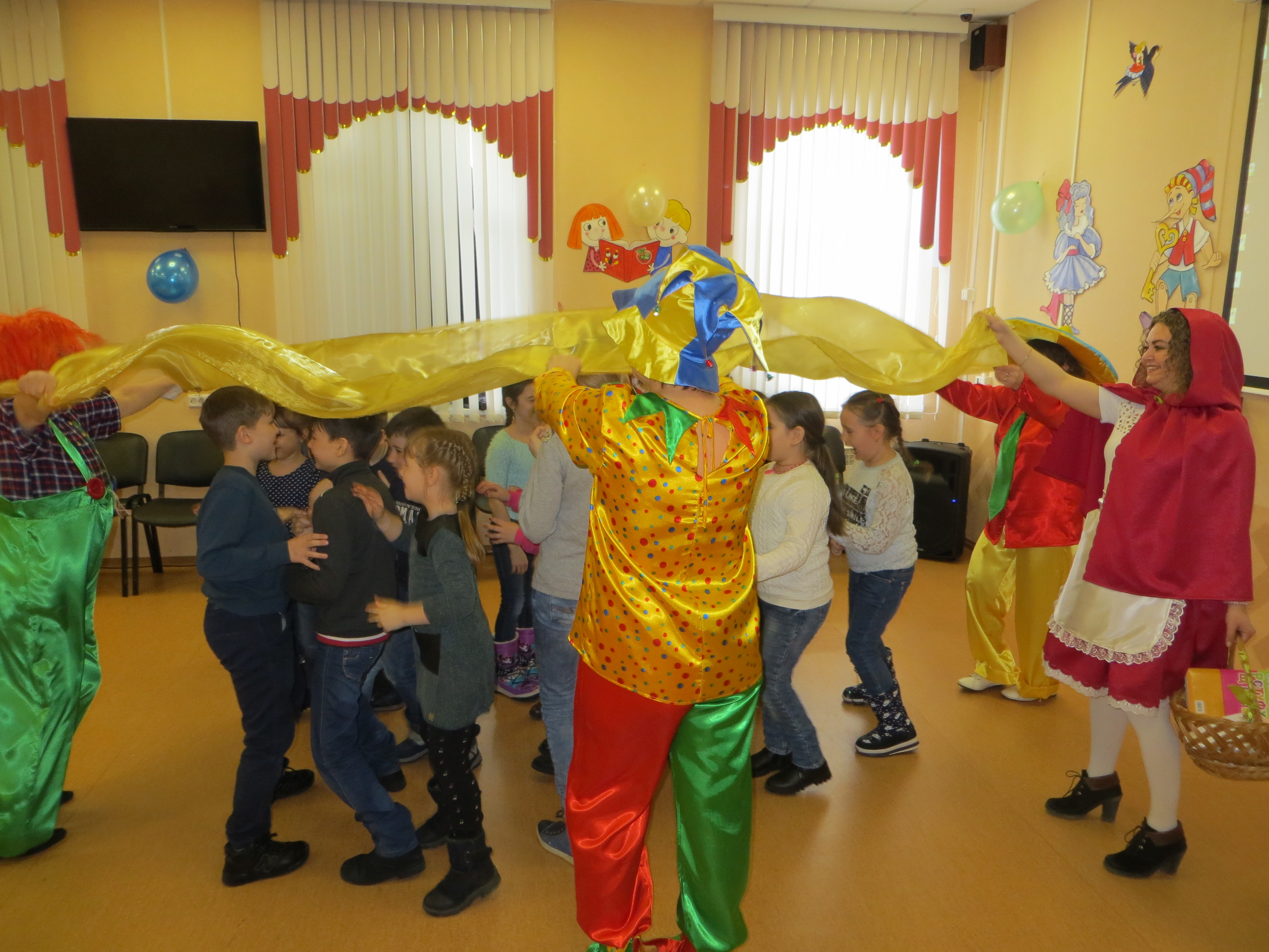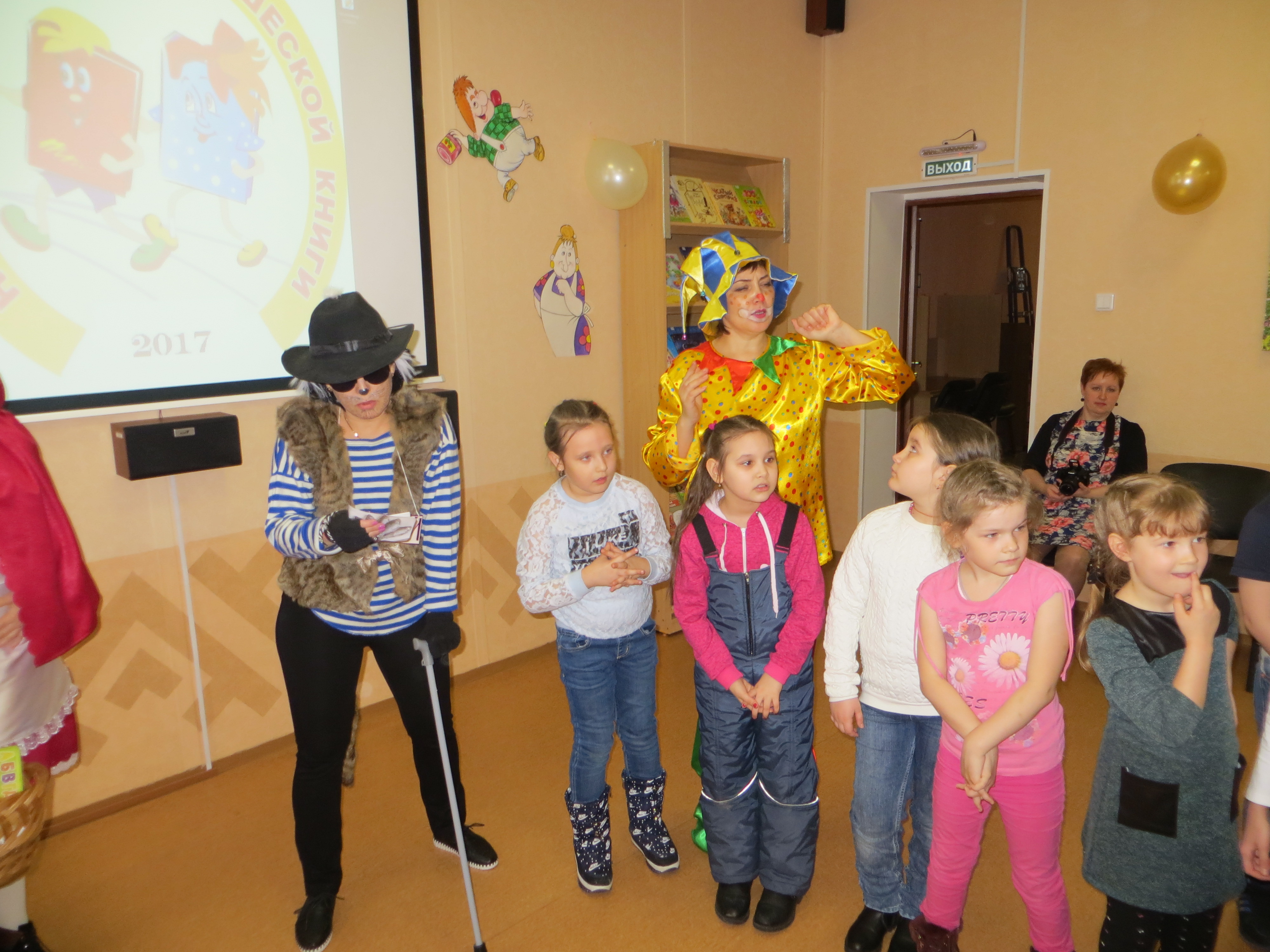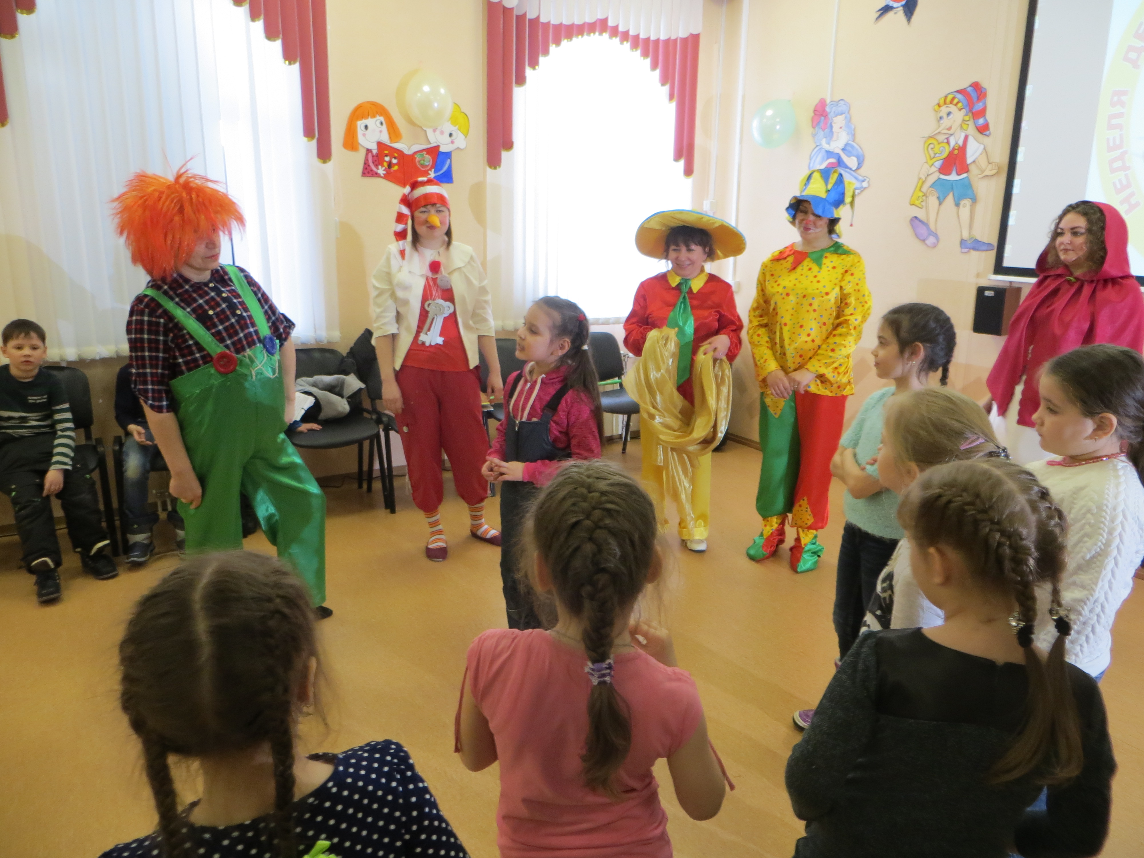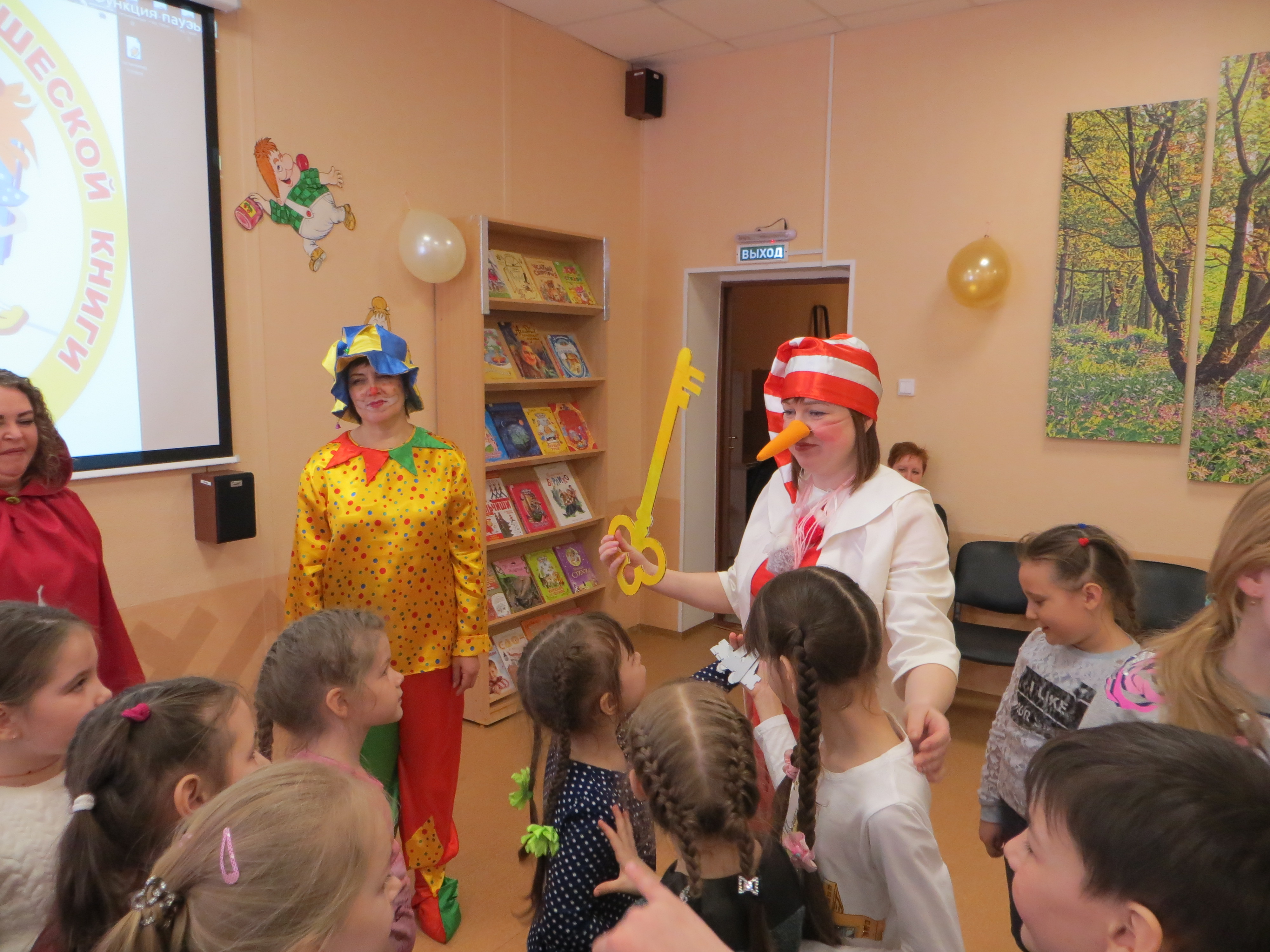Гостей праздника — юных читателей, пришедших в этот замечательный день на Книжкины именины, в фойе Центральной городской библиотеки встречал веселый клоун Веснушка, который предложил ребятам помочь Буратино найти потерянный Золотой ключик.