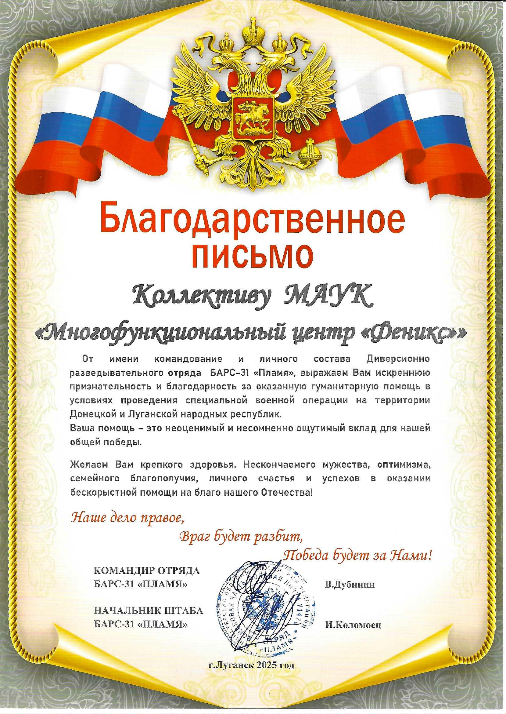 - Благодарственное письмо коллективу МАУК «МКЦ «Феникс» от имени командования и личного состава Диверсионно разведывательного отряда БАРС-31 «Пламя»