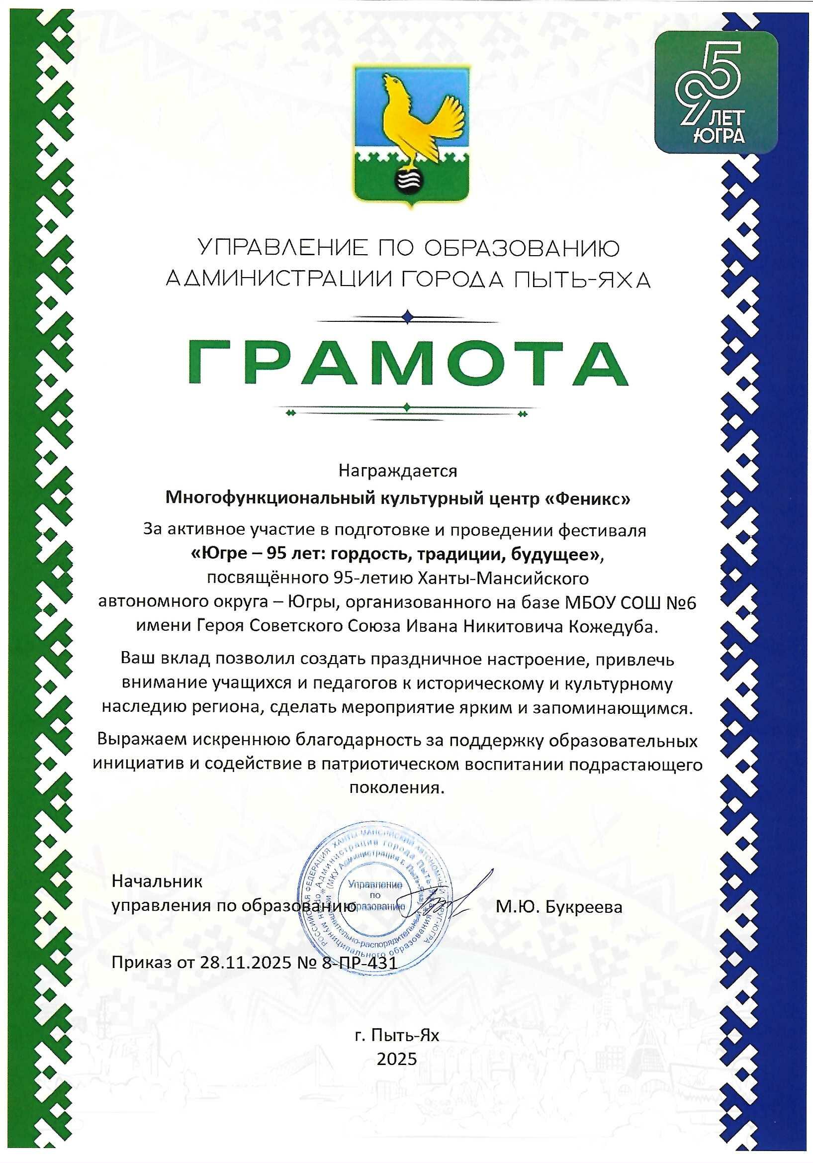 - Грамота за активное участие в подготовке и проведении фестиваля «Югре-95 лет: гордость, традиции, будущее».