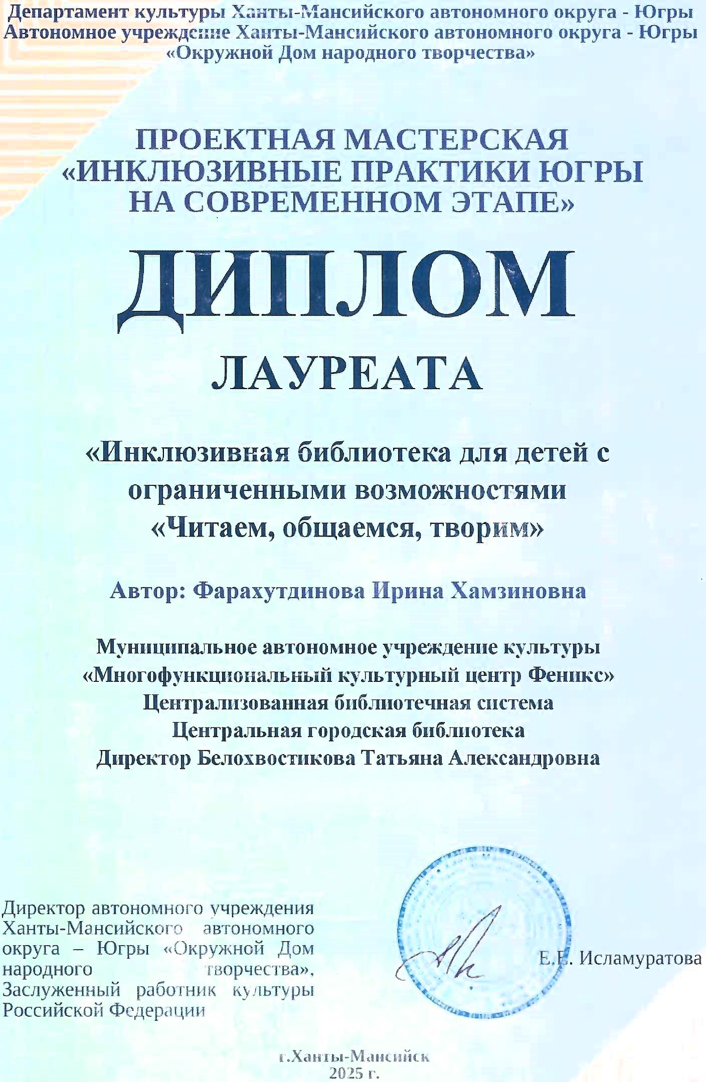 - Диплом лауреата «инклюзивная библиотека для детей с ограниченными возможностями «Читаем, общаемся, творим»