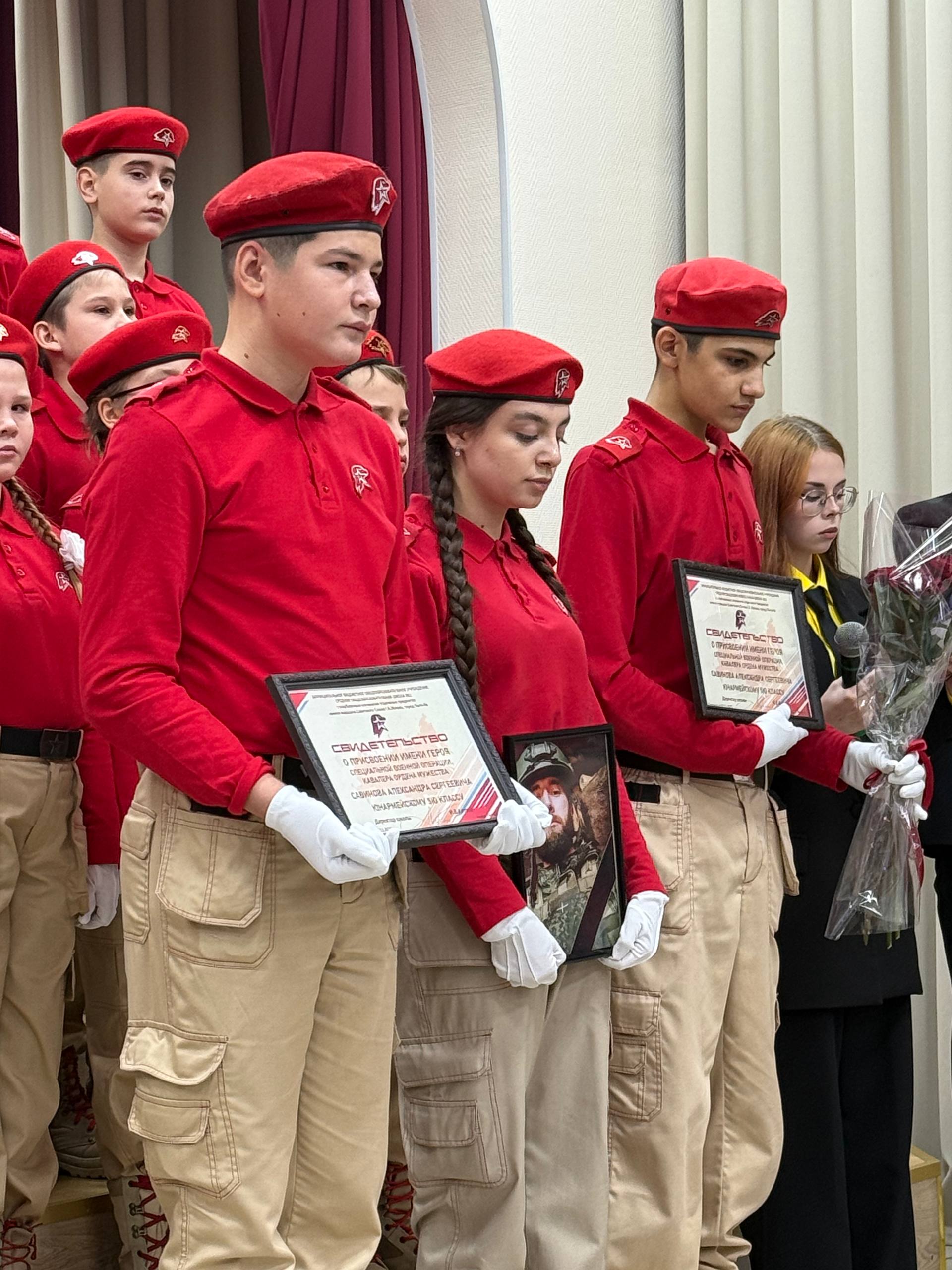 В этом году приказом директора школы, классу новоиспеченных юнармейцев присвоено имя героя специальной военной операции, кавалера ордена Мужества Савинова Александра Сергеевича.