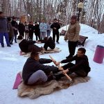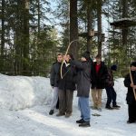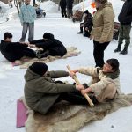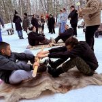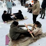 — накидывание тынзяна (аркан) на хорей (шест). В этом испытании участники должны были показать свою точность и умение обращаться с традиционными орудиями охоты и быта. Задача заключалась в том, чтобы как можно быстрее и точнее набросить длинный веревочный аркан на вертикальный шест. Это упражнение развивает глазомер, координацию движений и терпение;